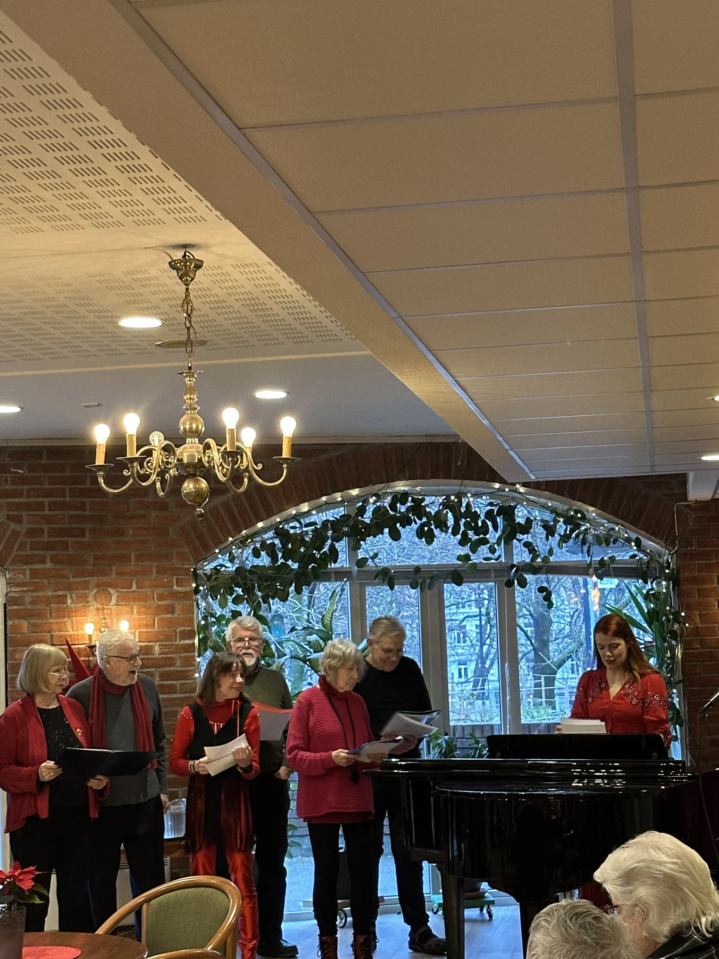 I høst har jeg ledet denne lille gjengen gjennom sangstunder på tirsdager. De mener de er døden nær (ikke på grunn av sanggruppa), og derfor var det ekstra gøy at de kastet seg uti og kjørte julekonsert i går for et stort publikum- med 40 minutters program, champis i glassene og flygelakkompagnement.