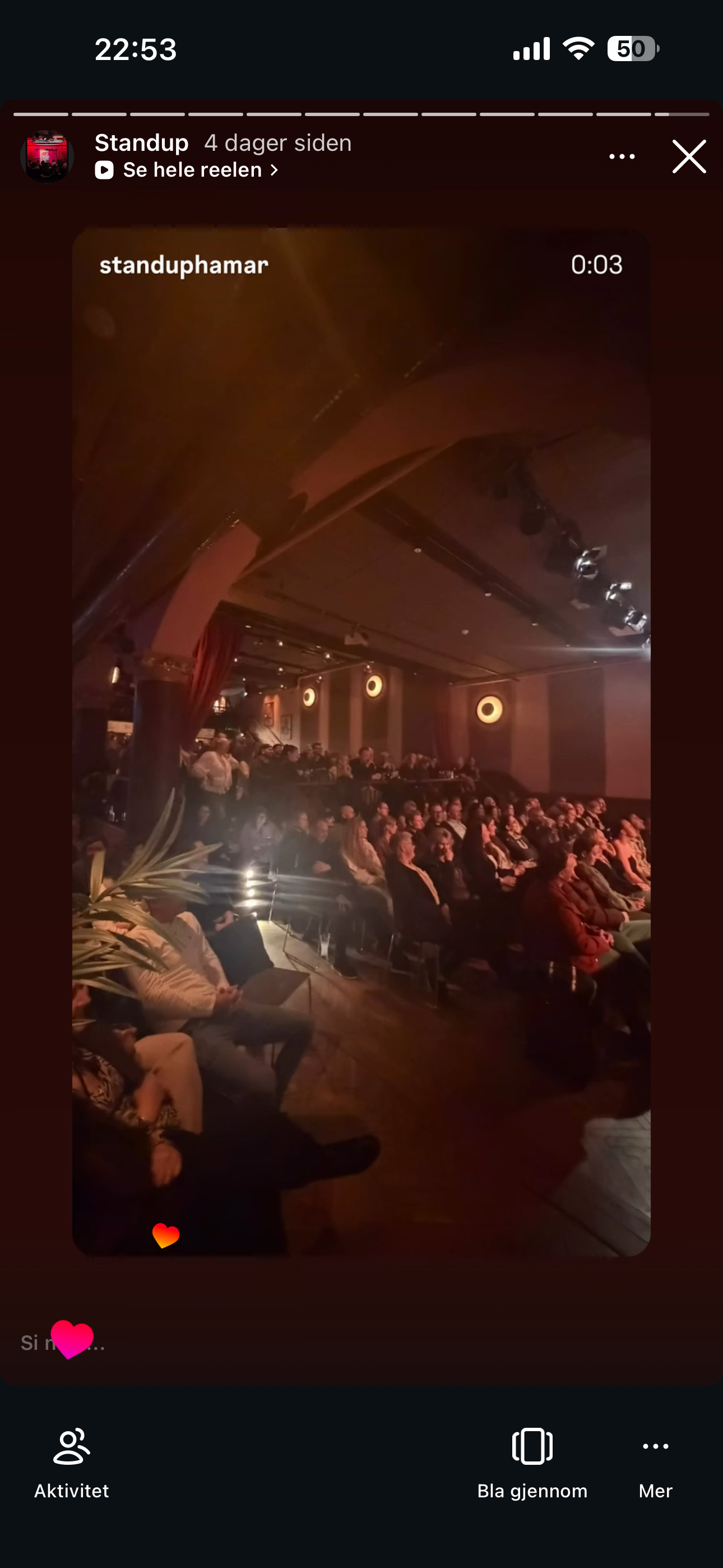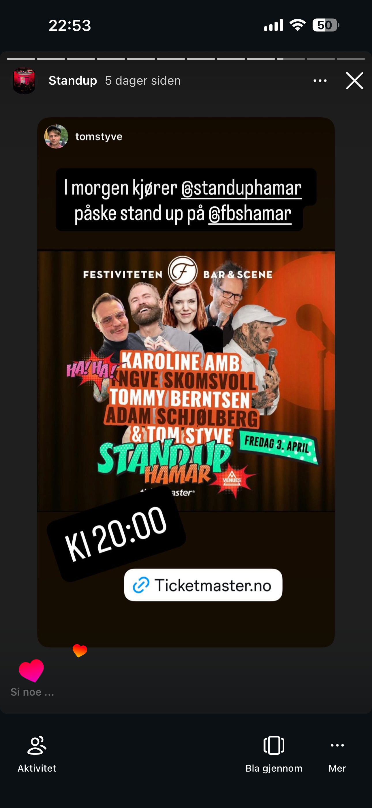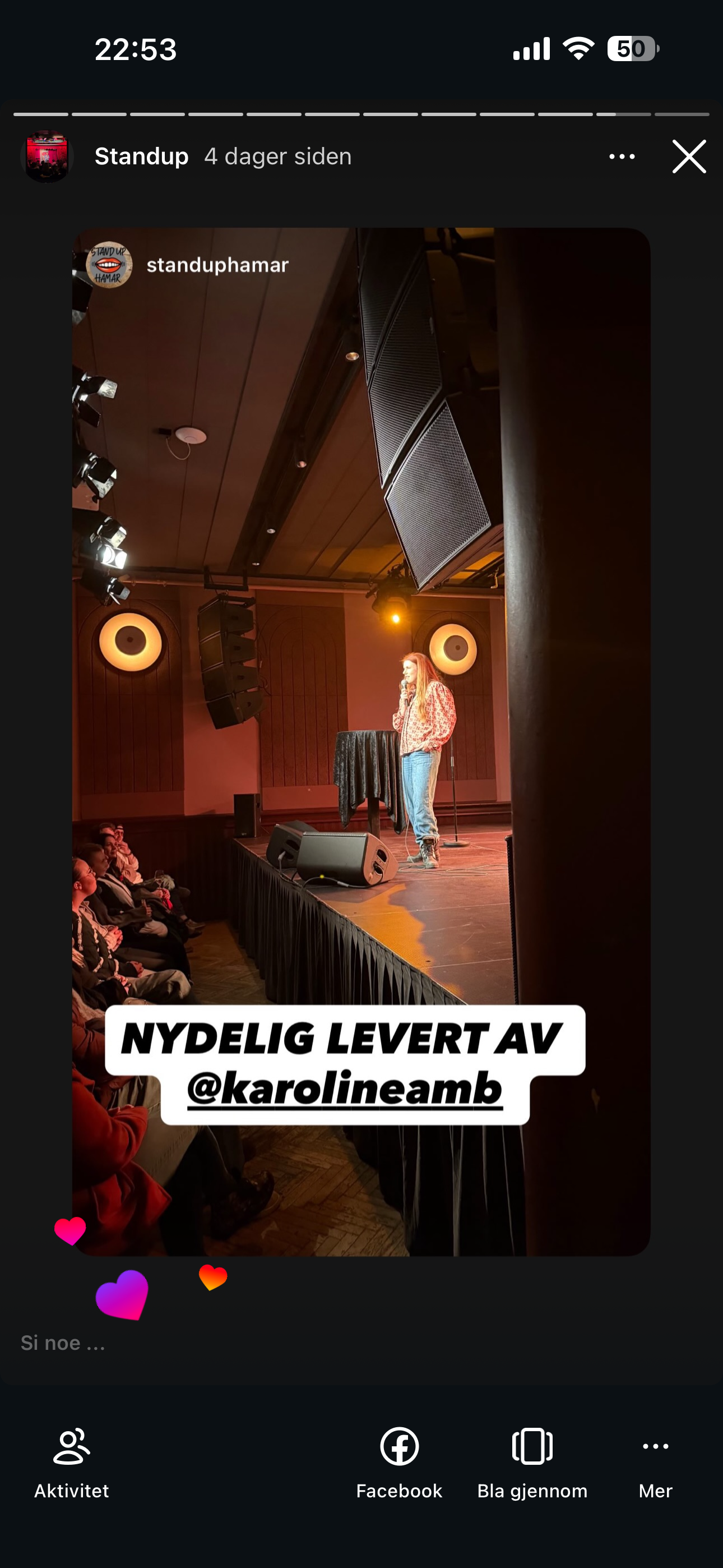 Jeg fikk teste standup i Hamar for første gang, under ledelse av Tom Styve, knallbra opplegg, og inspirerende komikere å dele scene med: Adam Schjølberg, Tommy Berntsen, Yngve Sundvor og Tom Styve.